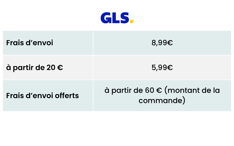 Le montant des frais de port est de 5,99 € pour une livraison avec notre partenaire GLS. Si le montant de la commande est supérieur à 60 €, les frais sont offerts.